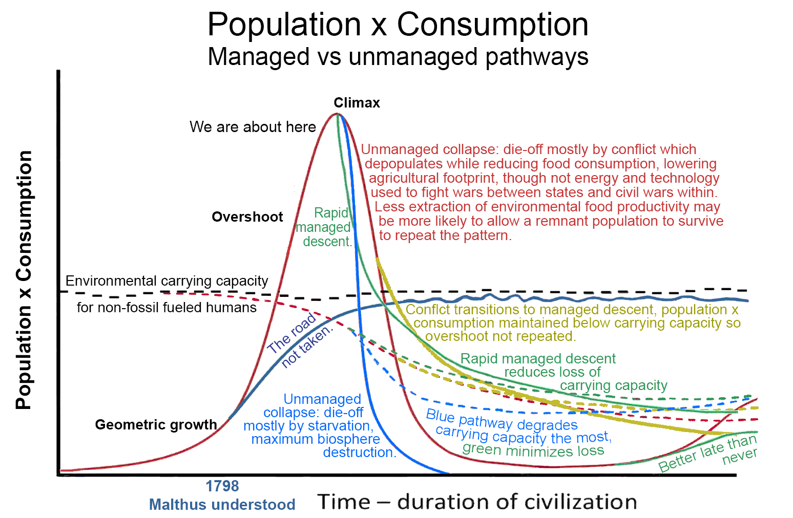But we have not been sapient, and so the necessary degrowth will likely have to be over one or two lifetimes. Sorry about that, posterity. The chaotic degrowth could well result in a vast loss of information (memetic), i.e. no literate, numerate, nor ecolate humans, as usual, may survive the rapid unmanaged descent/contraction.